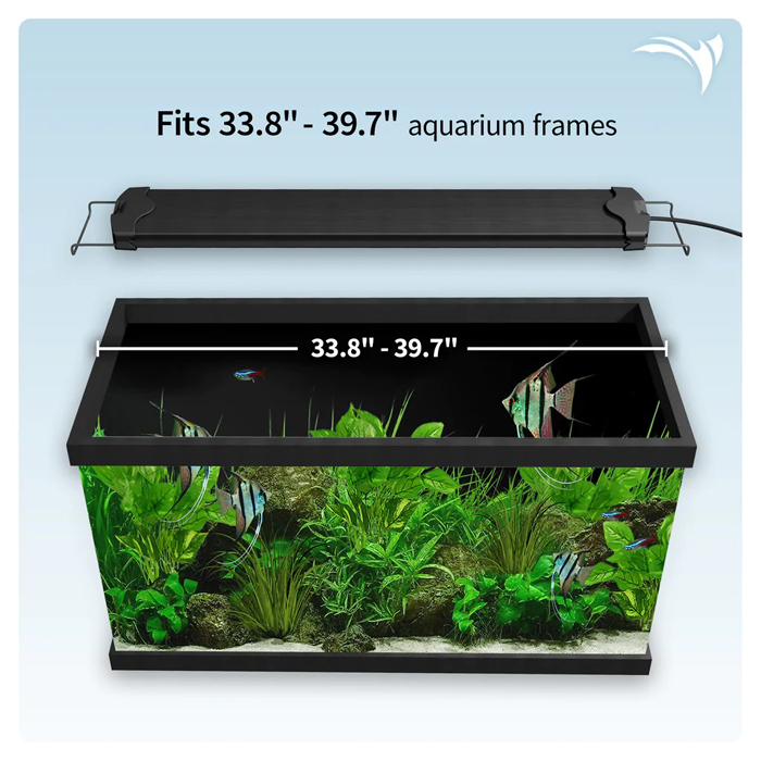 SKINNY -At 3/4” thick, the rustproof aluminum housing provides a low profile while delivering performance. The adjustable mounting legs fit aquarium frames 23.25” to 29.5” (24” light), 33.8” to 39.7” (36” light) and 44.5” to 50.4” (48” light).