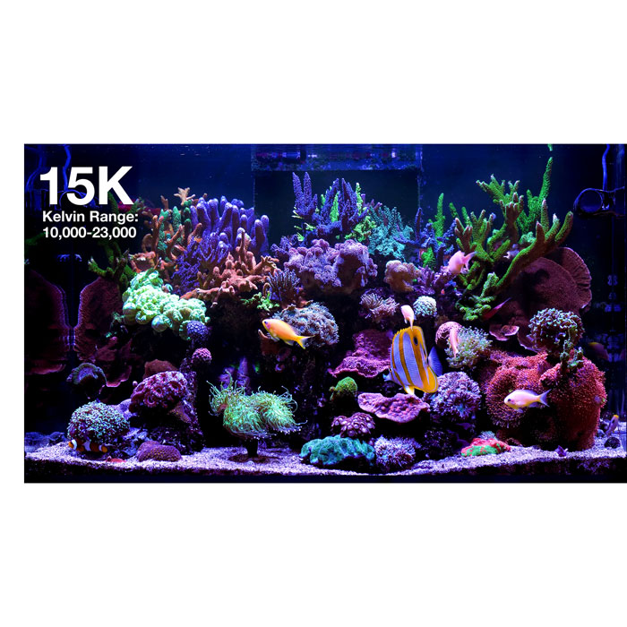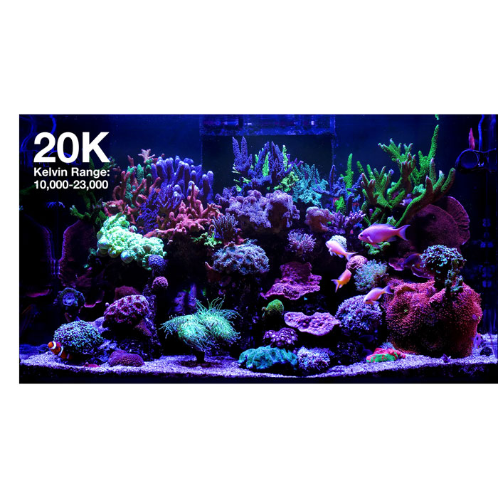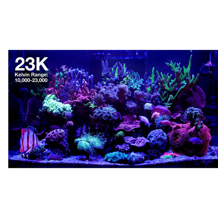 The ReefLED G2s benefit from a completely new chipset in their compact arrays, delivering a richer spectrum, and thanks to their new power management feature, they can be tuned from a 10,000K reef-white to a 23,000K blue running at full intensity, which was not available in the G1. Their signature REEF-SPEC Blue has also been augmented with violet and ultra-violet and boosted to 470nm blue at the top of the spectrum, causing fish and corals to truly shine.